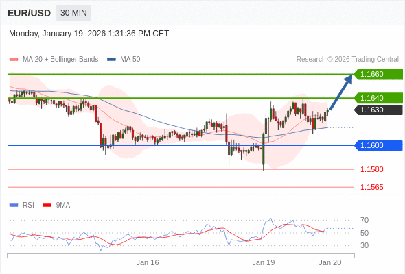 欧元/美元 当日内: 在1.1600之上,看涨。