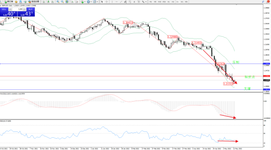 市场空头动力延续布林带指标通道中下轨区间持续震荡下行,低位抵达1.21555附近节点开始整理,短期空头动力有继续下行态势,布林带指标呈空头动力不断震荡下行,开始逐渐收口,上方压制关注1.26362附近,低位支撑关注1.20122附近,关注1.23361附近转折点,MACD指标处于空头区域低位维持弱势下行,RSI处于50均衡线下侧空头区域维持弱势徘徊中,如图;