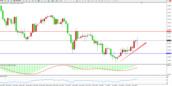 低位多头动力强势反转拉升上扬,短期多头有继续向上移动迹象,上方压制关注1.23444附近,低位支撑关注1.19324附近,市场看涨情绪开始升温,MACD指标处于空头区域维持震荡上移至0轴线附近徘徊,RSI指标处于50均衡线上侧窄幅整理,如图: