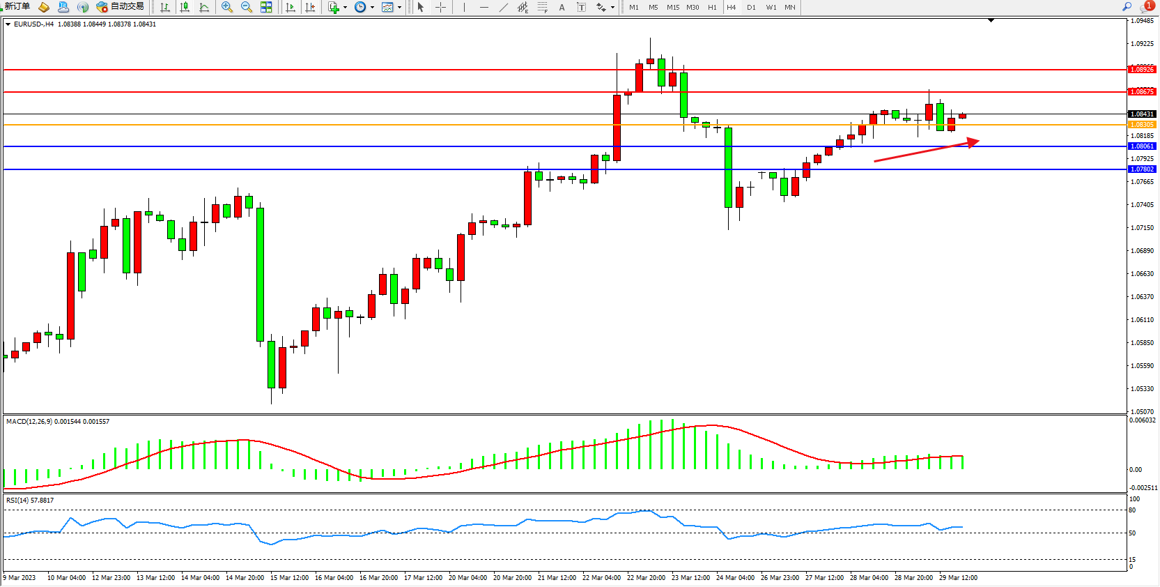 交易策略:1.08305上方看涨,目标1.08675  1.08926