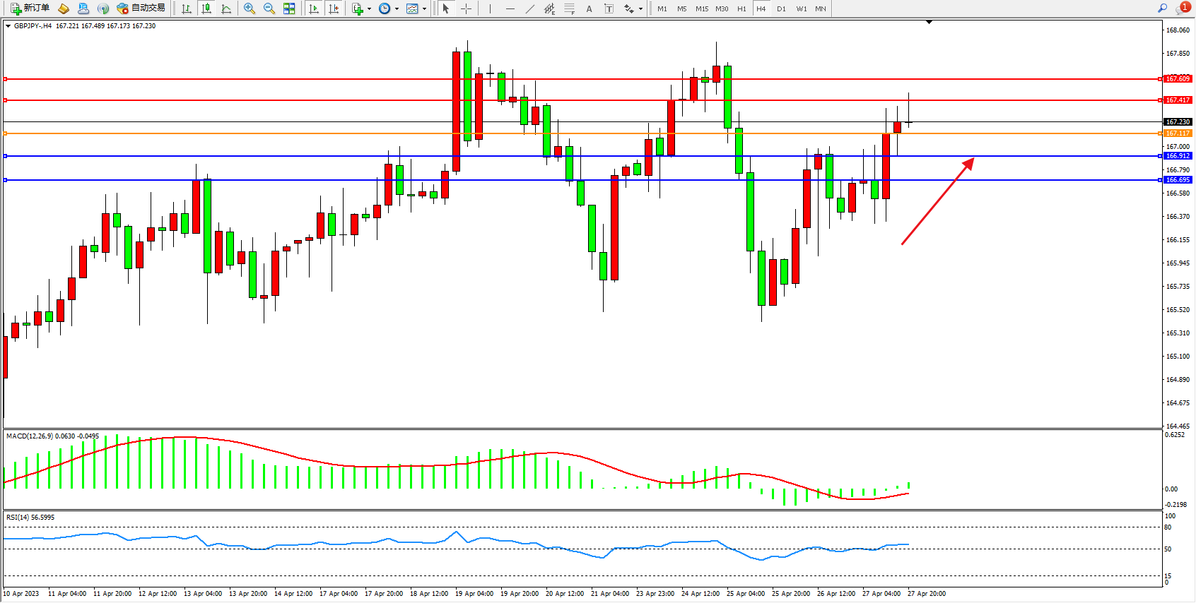 交易策略:167.117上方看涨,目标167.417  167.609