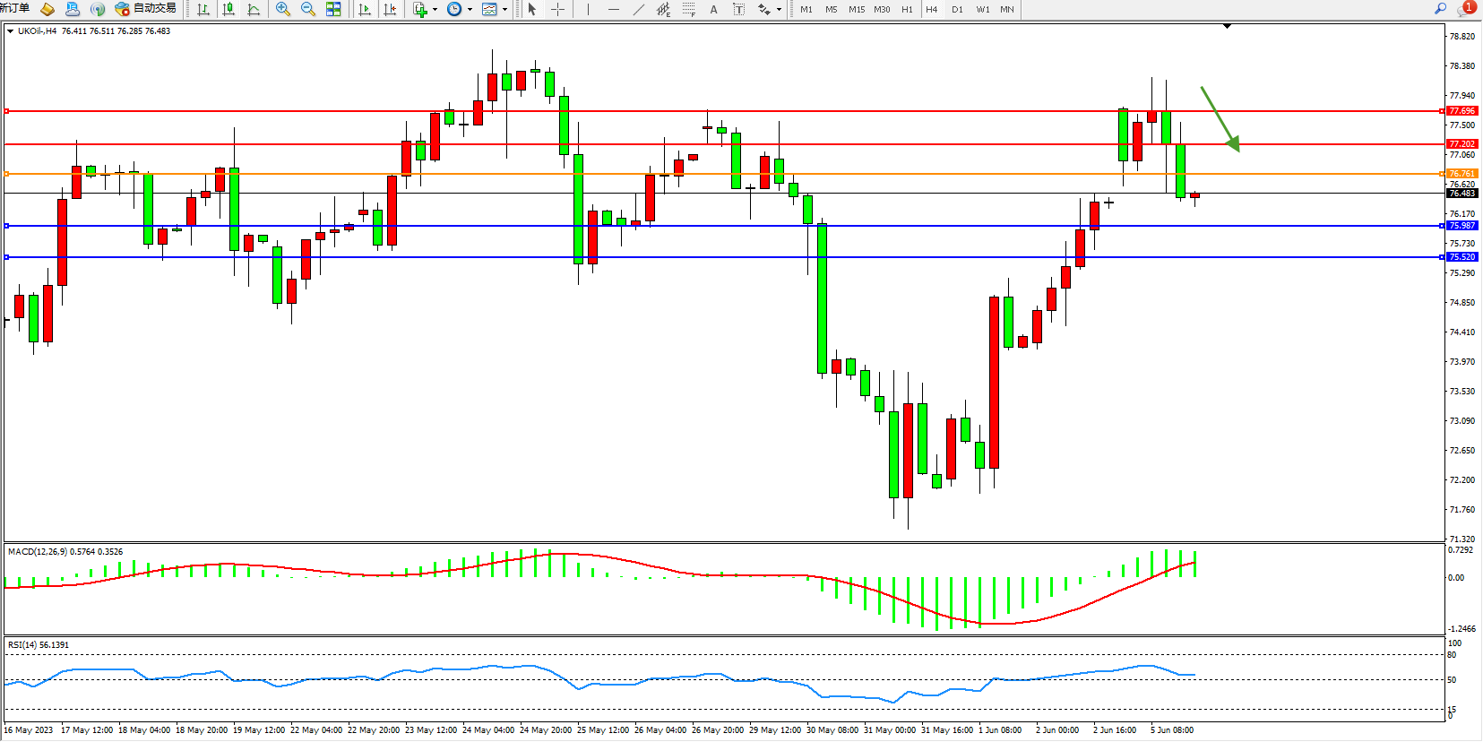 4小时图看:高位短期宽幅震荡,多头动力有继续震荡上移迹象,MACD指标多头区域维持整理,RSI指标处于50均衡线上側弱势徘徊;