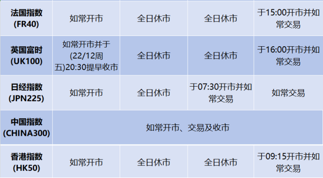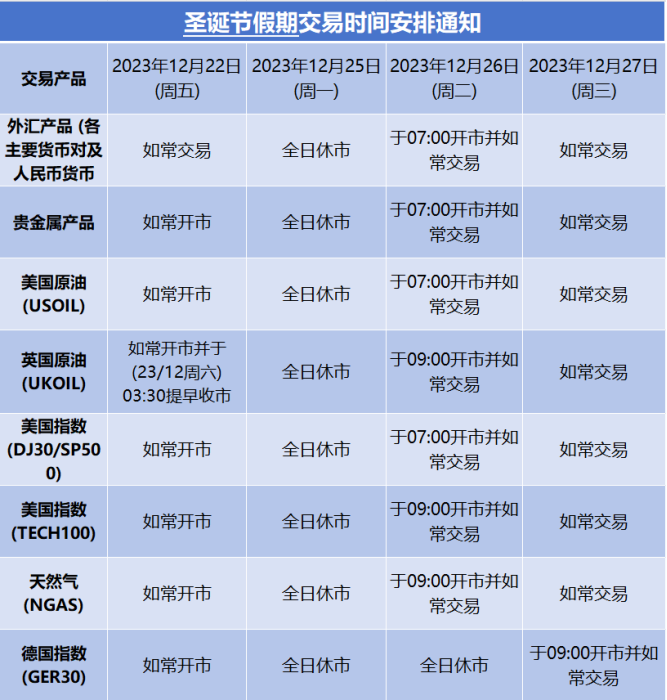 由于各地市场圣诞节假期影响,本公司以下产品的交易时间将于2023年12月22日(周五)至12月27日(周三)作出如下安排,敬请留意。