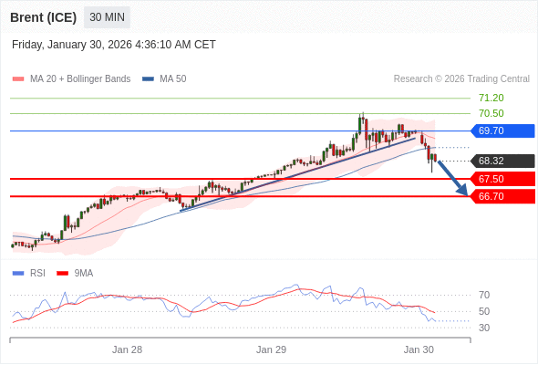 交易策略: 在 69.70 之下,看跌,目标价位为 67.50 ,然后为 66.70 。